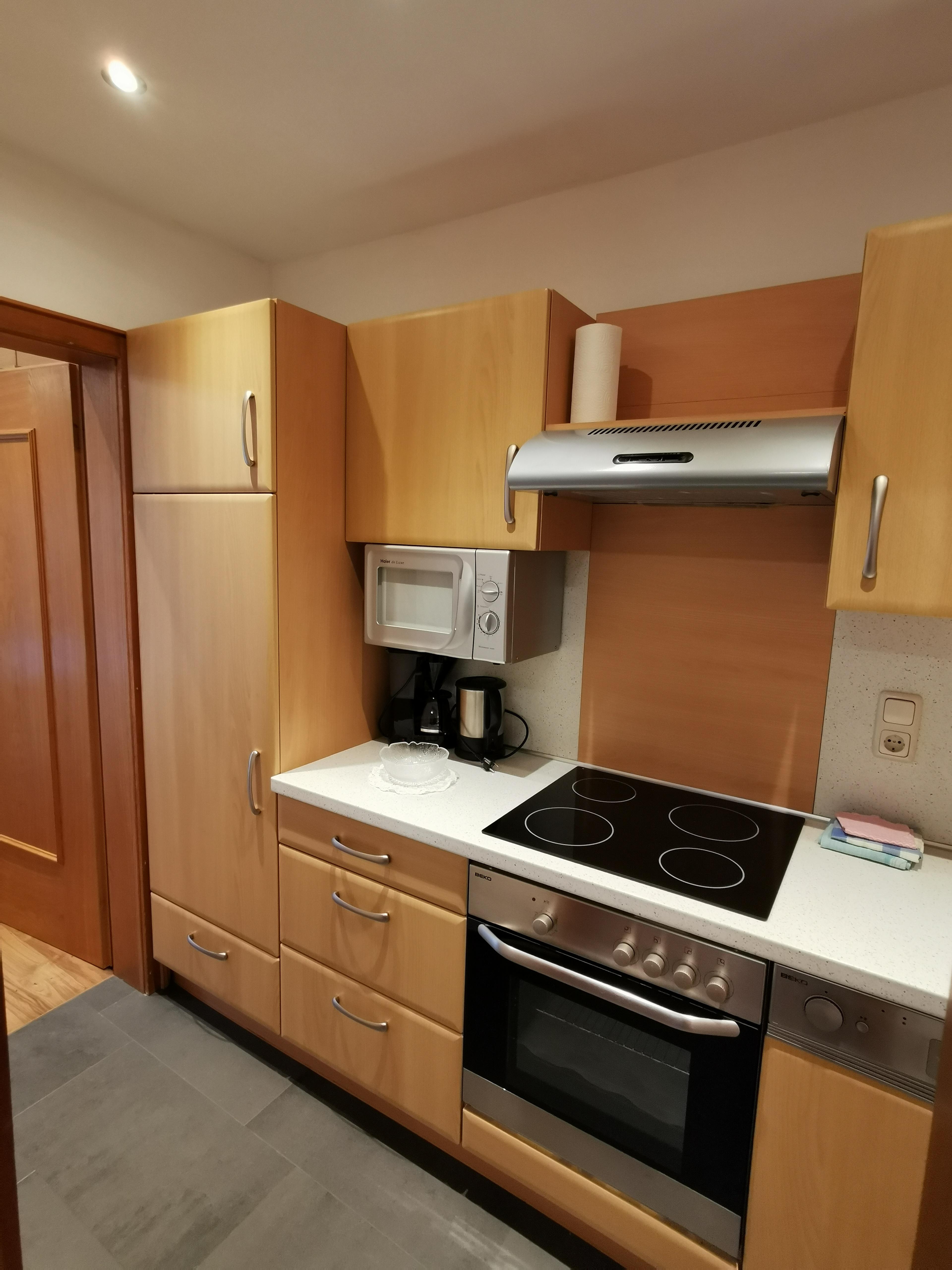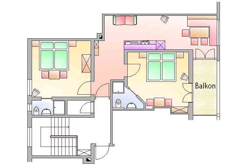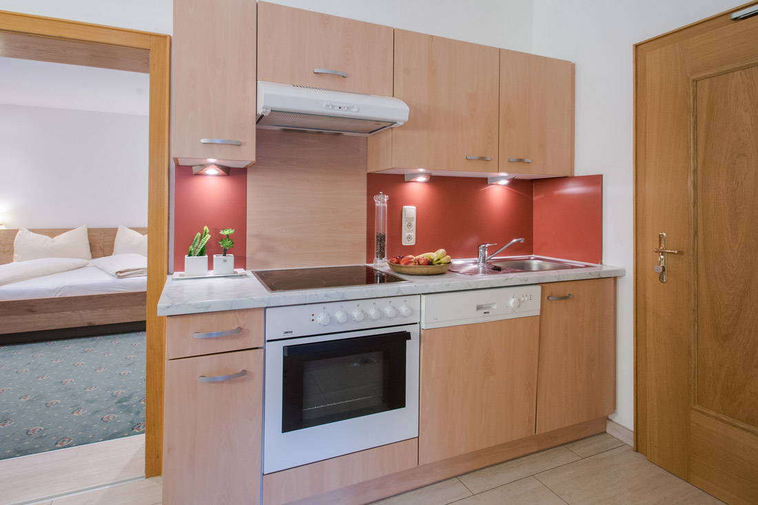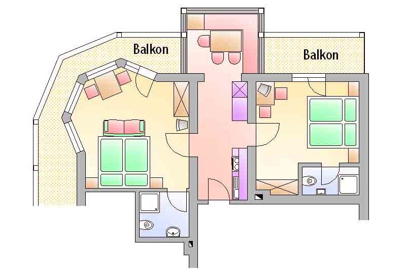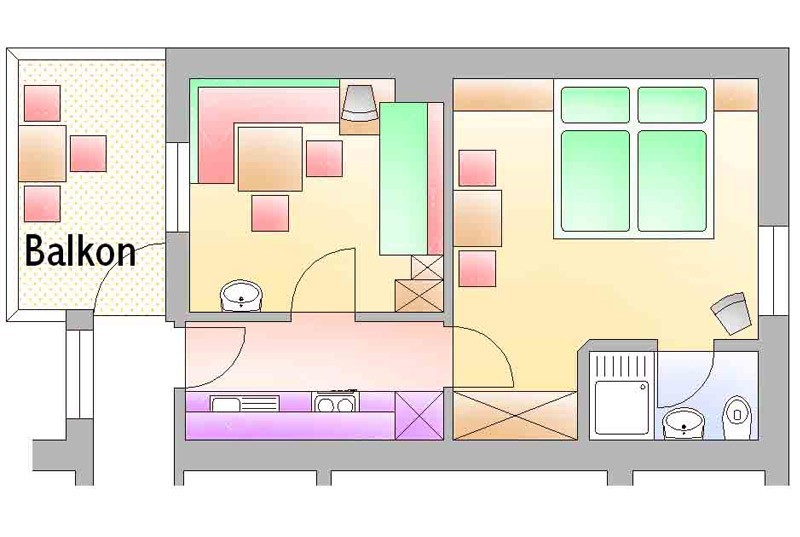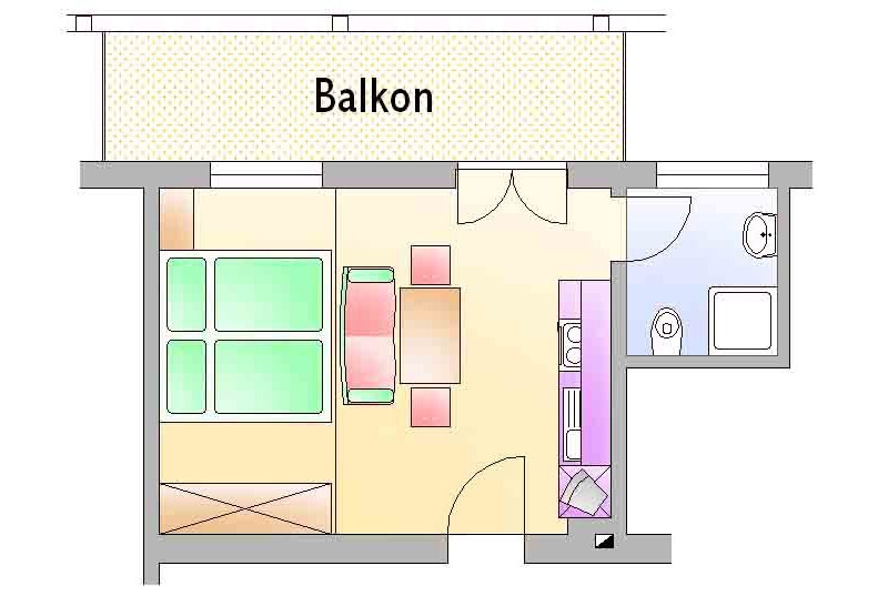 Our apartment (number 4 and 6) for two to three persons (30 m²) has a separate living and sleeping area, a bathroom with shower / WC, satellite TV (flat screen), radio and a large balcony. The kitchen is equipped with ceramic hob, oven, microwave, dishwasher, large fridge with freezer and all necessary dishes.