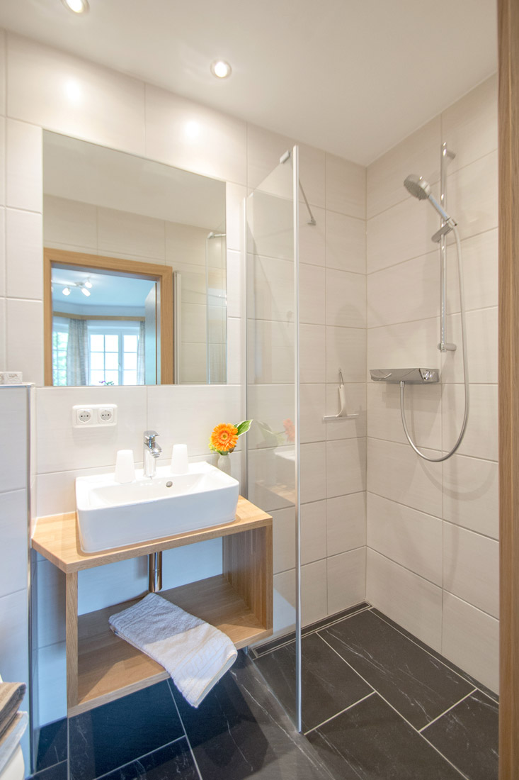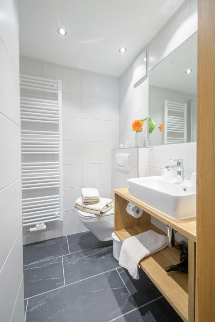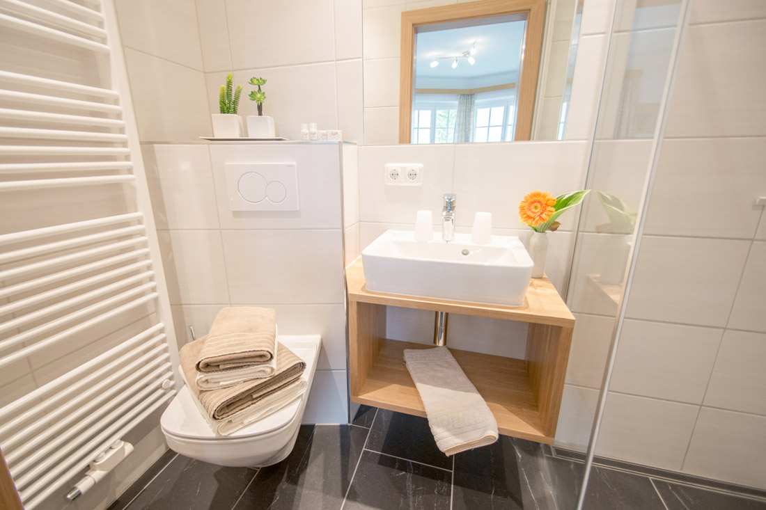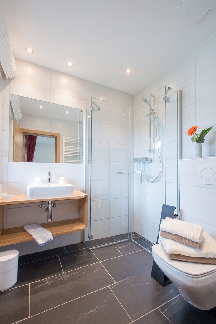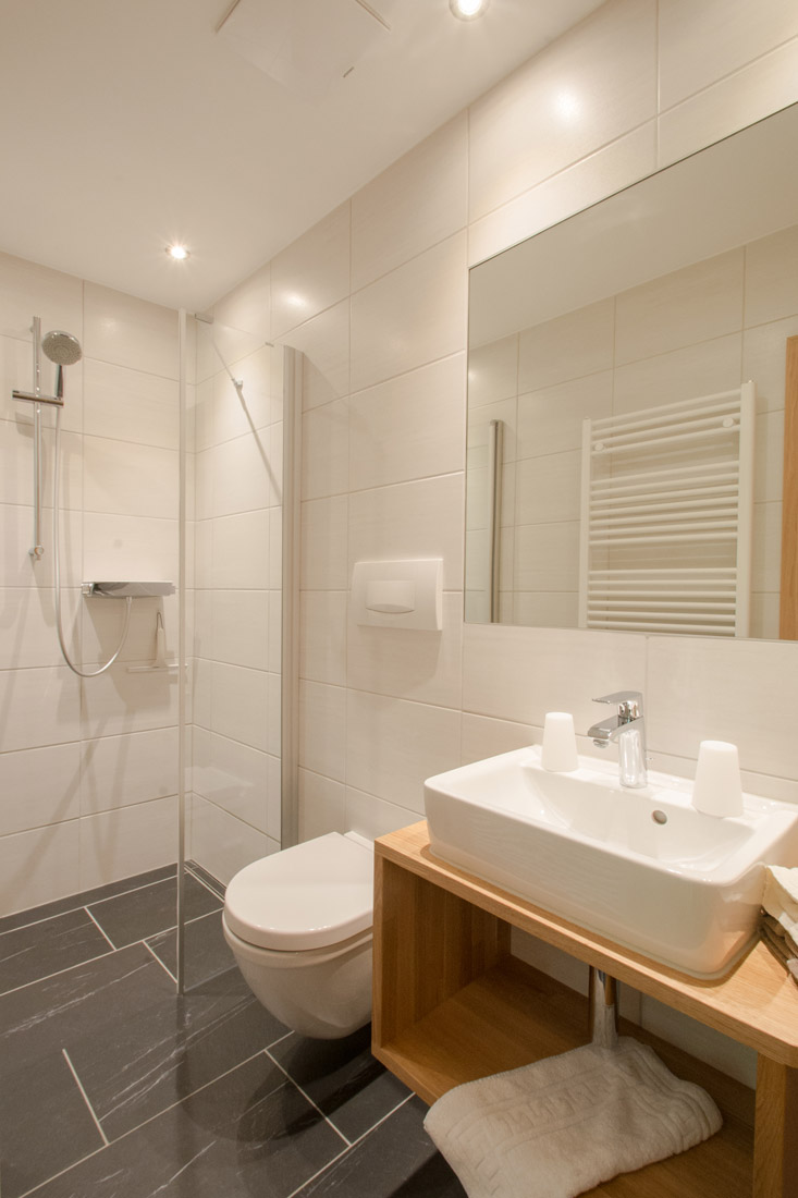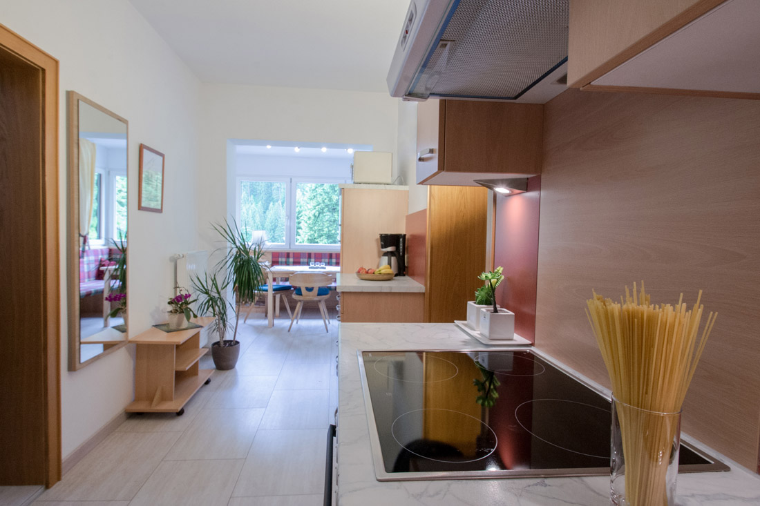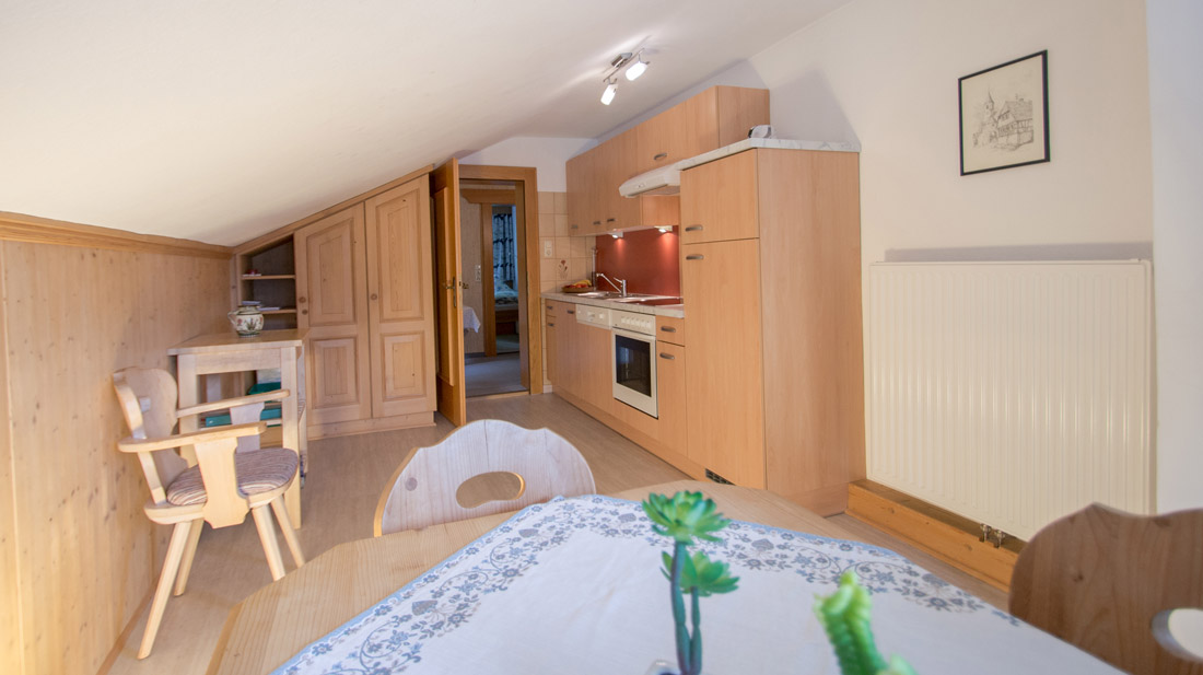 Our apartment (number 1,2,3 and 5) for 4-6 persons (60m²) has a kitchen with ceramic hob, oven, microwave, dishwasher, large fridge with freezer and all necessary dishes, two separate bedrooms with private shower and private WC and SAT-TV. The view from the balcony to the Zugspitze will inspire you.