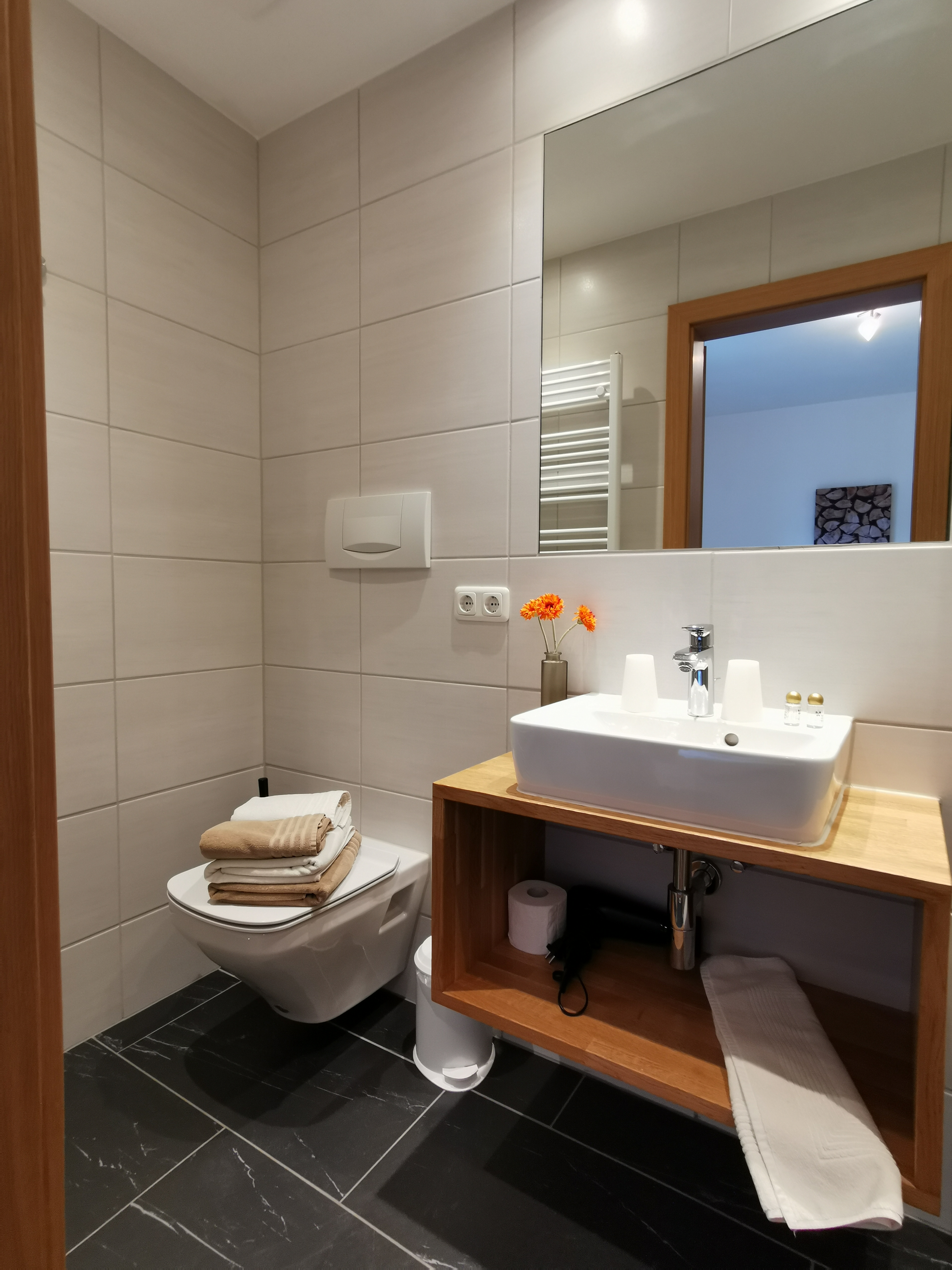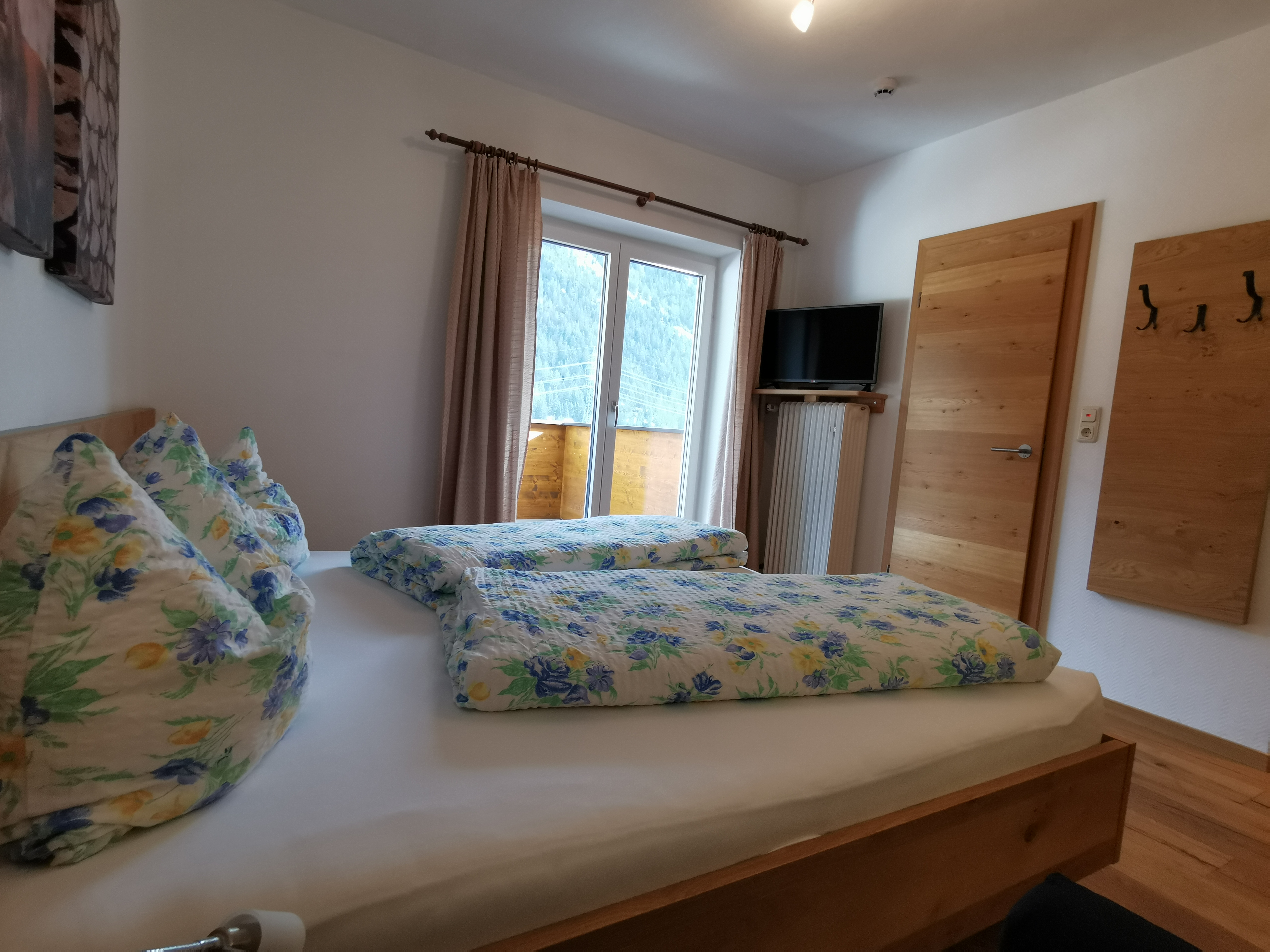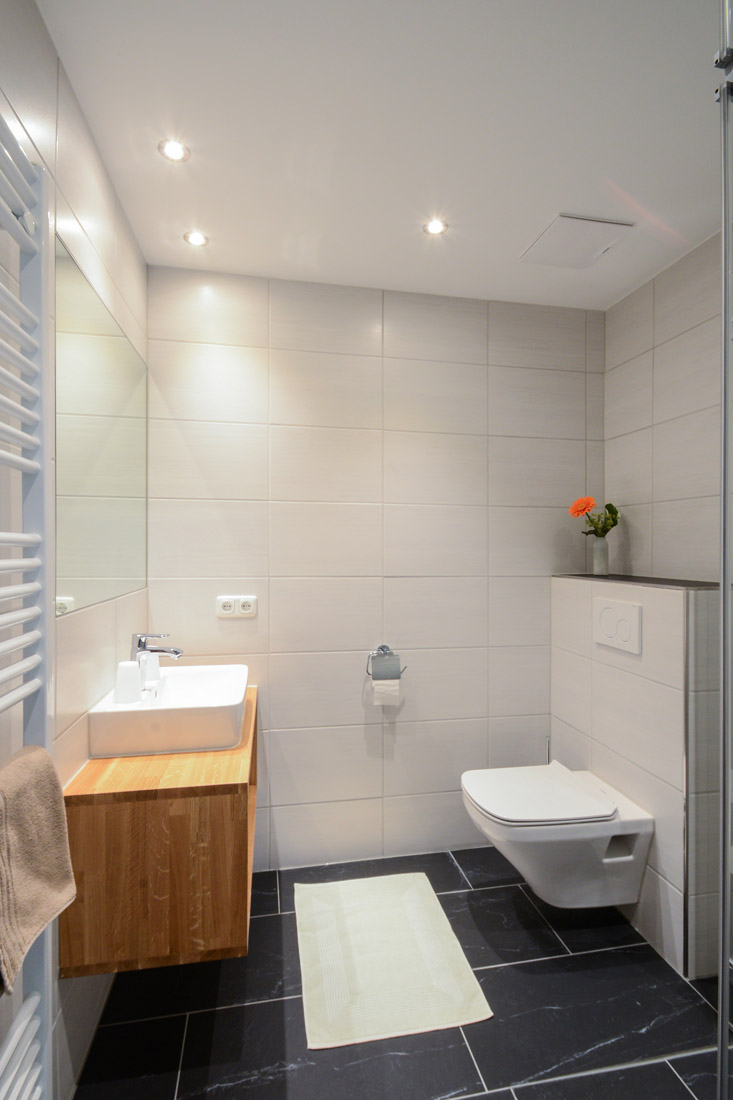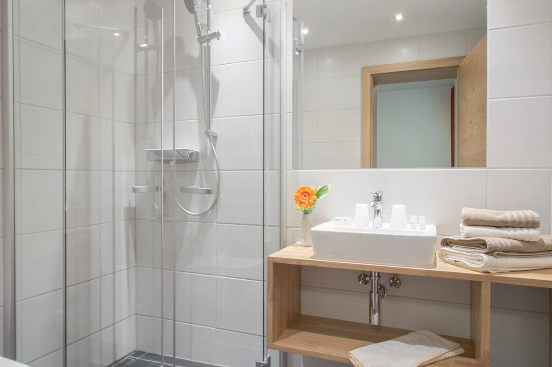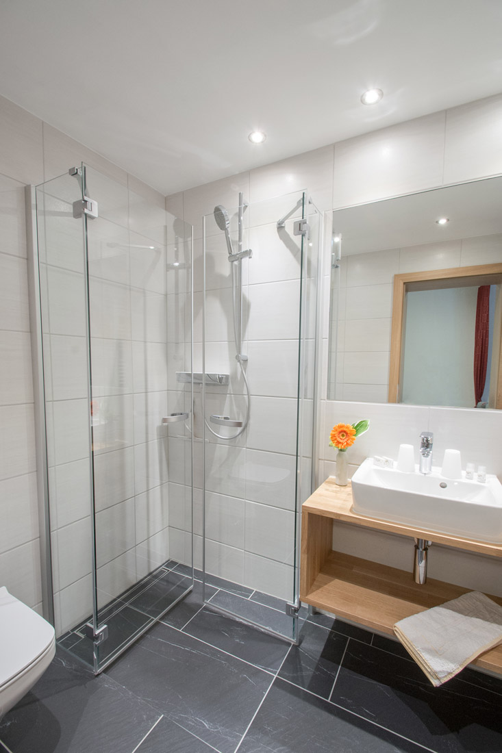Our apartment (number 1,2,3 and 5) for 4-6 persons (60m²) has a kitchen with ceramic hob, oven, microwave, dishwasher, large fridge with freezer and all necessary dishes, two separate bedrooms with private shower and private WC and SAT-TV. The view from the balcony to the Zugspitze will inspire you.